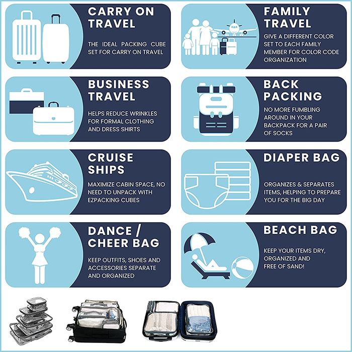 | *Scope of application | * Zipper closure * SMART TRAVEL PACKING – Say goodbye to all your travel woes! Pinzon packing cubes organize your belongings within a suitcase or backpack for a tidy storage.Moreover, these pro packing cubes also help reduce wrinkles & mess. |