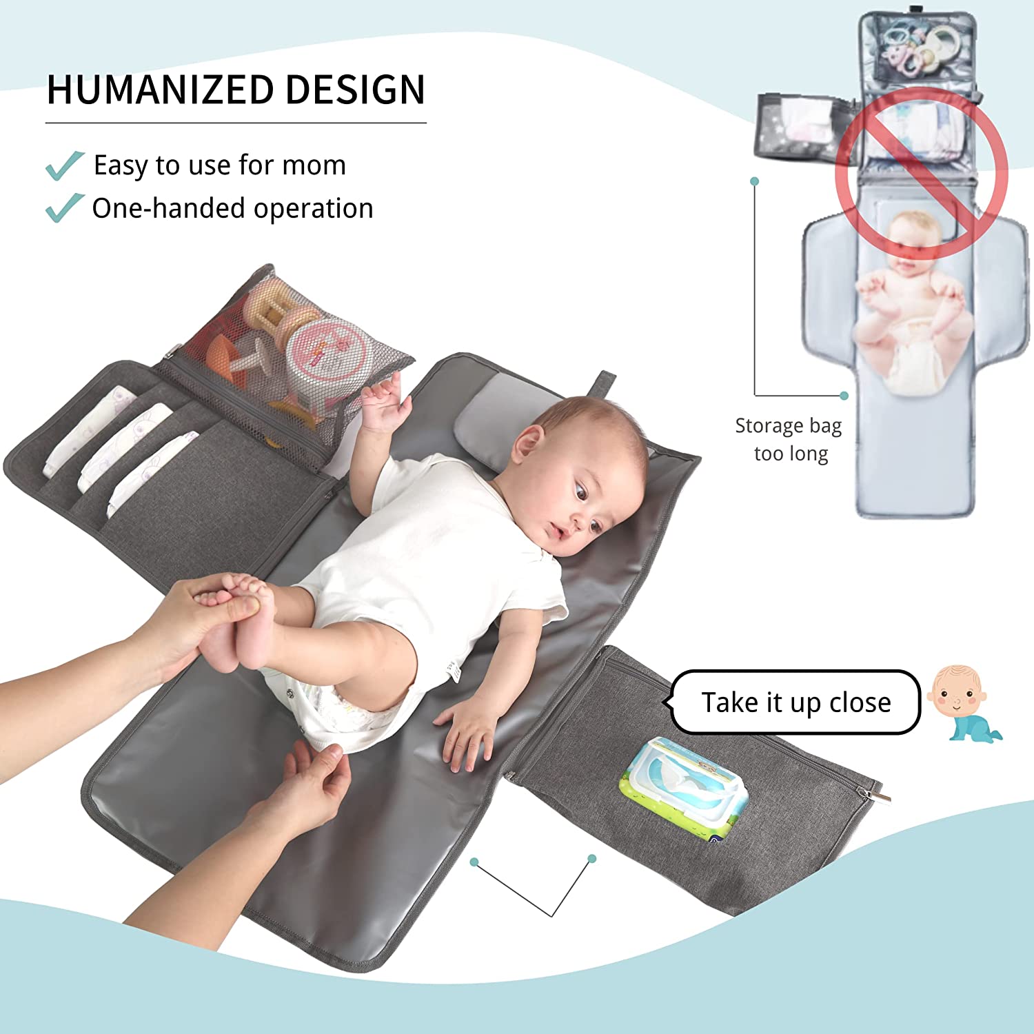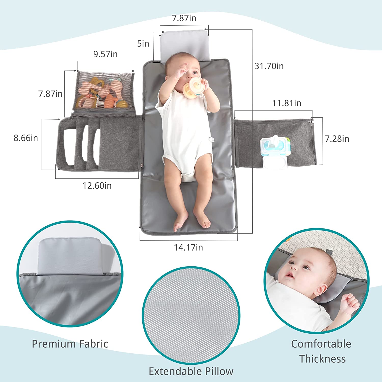 material is made of waterproof advanced PEVA.Removes stains with just a light wipe, no need for frequent cleaning * 【Enough Storage Space】 Changing Pad has enough storage space.①Supplies area: It can store baby diaper cream, teether, toys and other items, and the bag has a zipper to prevent it from falling; ②Diaper area: 3 compartments are open for storage, which can store diapers or one-piece suits for a day; ③ Wipes pcket area: large height enough to fit all kinds of wipes * 【EPE Pillow】Changing pad has a comfortable and foldable pearl cotton pillow (7.87in*4.72in), when the pillow is opened, the diaper pad is 31.88in long and 14.31in wide (this is more than other diapers pads grow much longer),Suitable for baby under 18 months and height under 32inches * 【Humanized Design】 According to the usage habits, the wet wipes bag is designed on the right side, which is convenient to take out and wipe ; the supplies and diaper area are on the left side (both removable).We upgraded the wipes pocket with snaps and Velcro reinforcements so we no longer fear the hassle of popping out when removing the wipes * 【Comfortable And Secure】your baby can lie down comfortably and enjoy a diaper change anytime, anywhere without fuss. Protect your baby from hard and dirty surfaces at public diaper changing stations. You can attach the portable pad to your stroller or hang it behind your car seat |