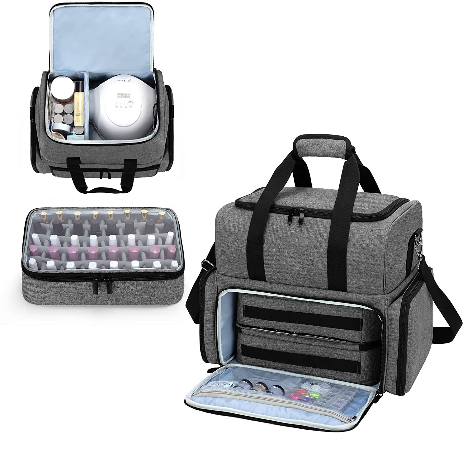 in total. (Notes: The divider insert is resizable & undetachable) * UPPER STORGAE SPACE – A detachable divider in the upper section to customize storage space for a regular size nail dryer (approx size 10″x 9″x5.5″) and bottles of nail remover. * OTHER TOOL STORAGE SECTIONS – 2 side pockets provide roomy space for dip powders and other manicure tools. There is also an adjustable shoulder strap and 2 sturdy handles for easy carrying. |