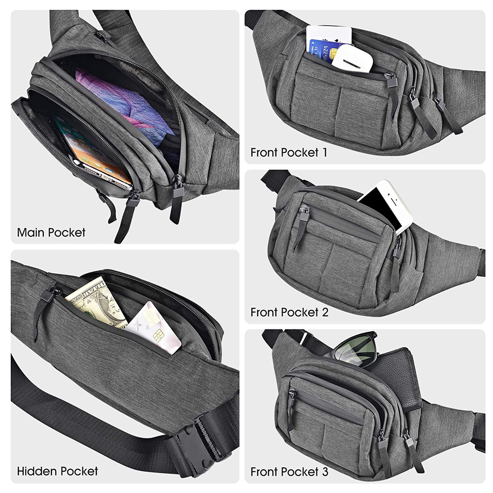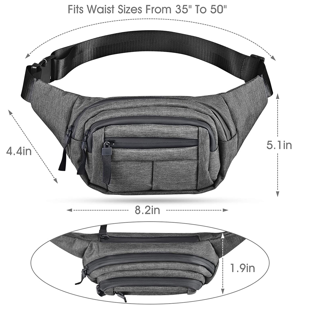 Fanny pack main pouch size: 8.2 x 5.9 inches (LxH) Adjustable waist strap (fits up to 45”) |