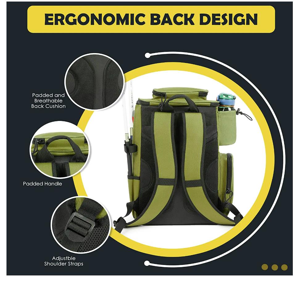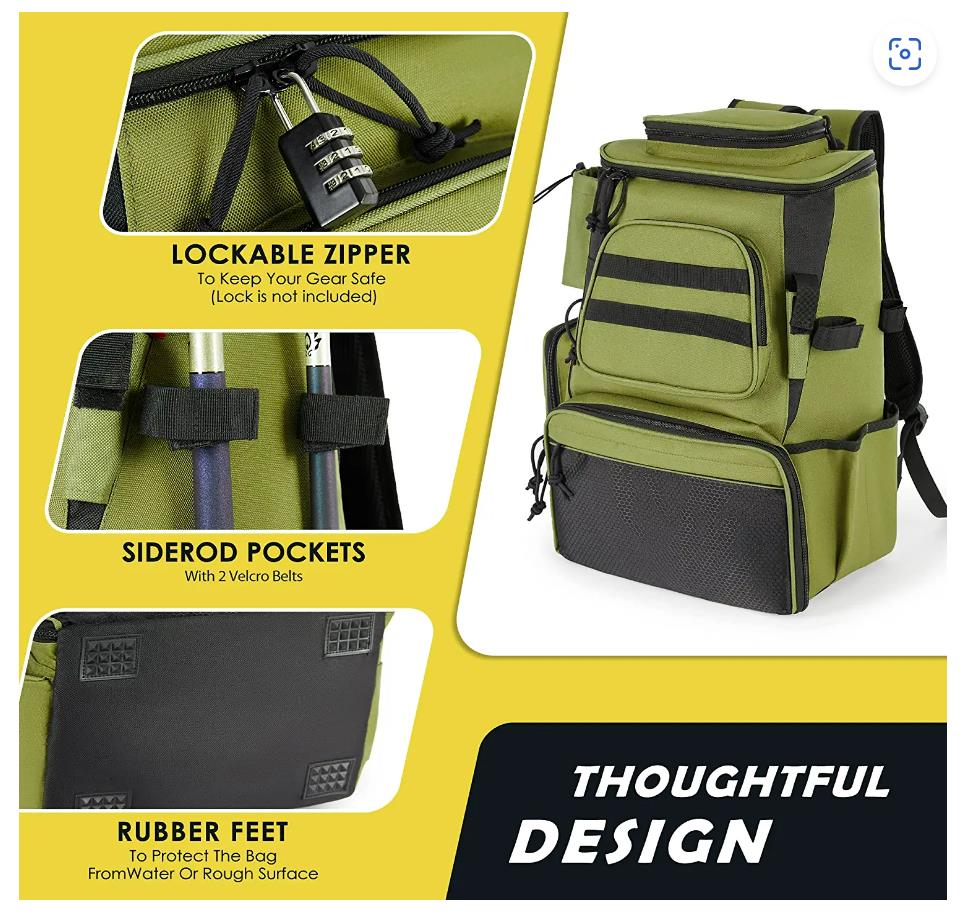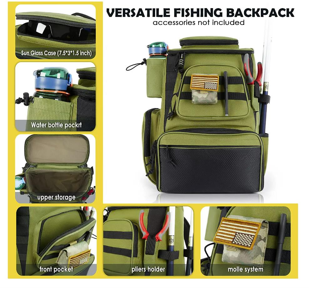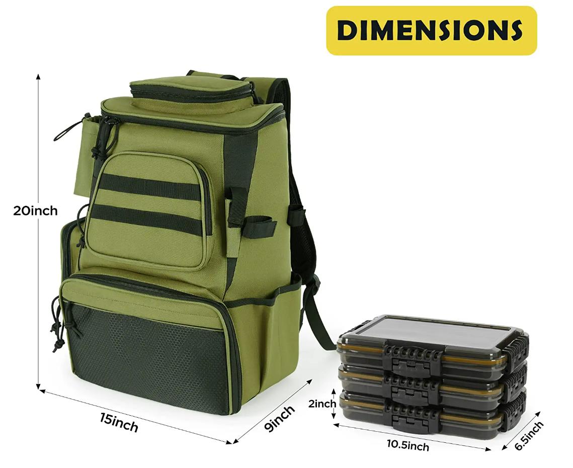 | *Technical Details | * 【LARGER STORAGE SPACE】The fishing backpack divides into two independent compartments. The lower main compartment can hold 3