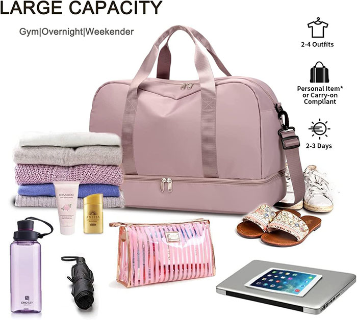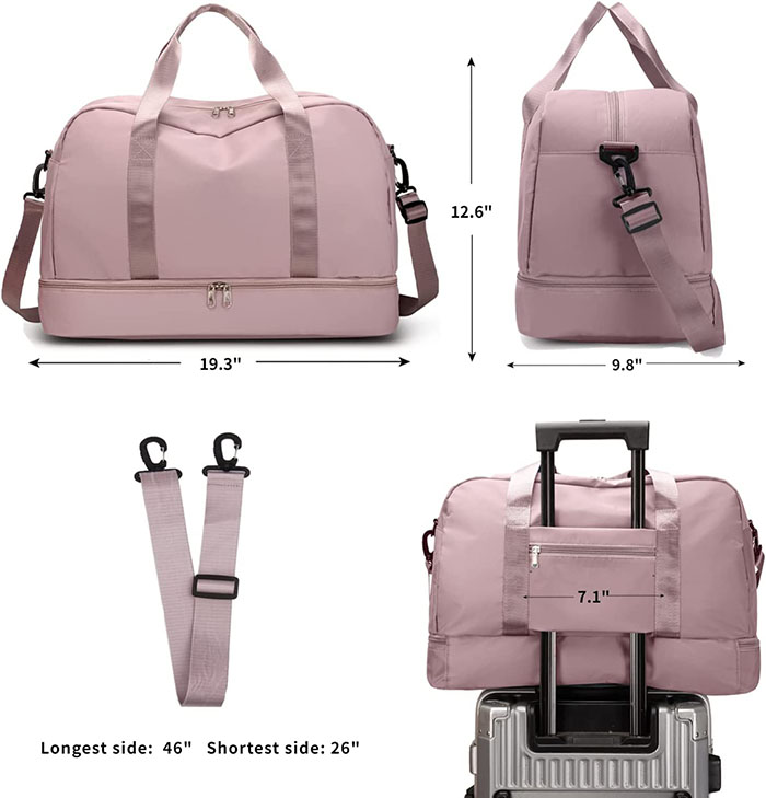 | *Style | * Dimension:19.3”L x 9.8”W x 12.6”H;The perfect carry on compliant bag for airline travel.You can carry this duffel bag onto an airplane.Integrated trolley sleeve slides over rolling luggage handle making airport travel a breeze * 【Wide Application Duffle Bag】Easily held all your gym or travel items,ideal for travel tote bag,gym tote bags,weekender bags,overnight bag,carry on bag,workout bag,yoga bag,sports bag,luggage bags,camp/airplane duffel bag,momy hospital bags.This cute duffle bags also can as sweat gift ideas for wife,friend, mother |